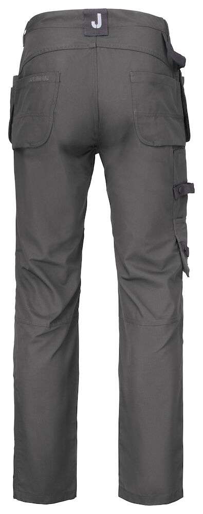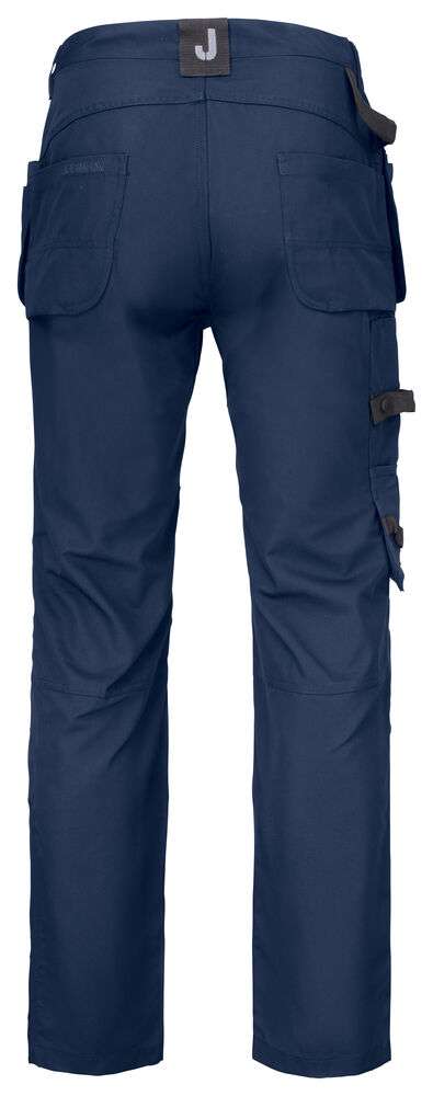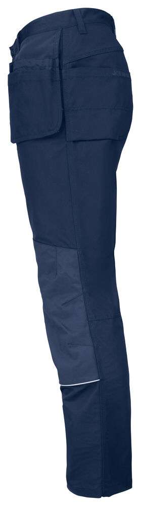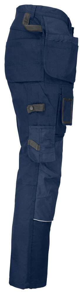 Canvas i polyester/bomull som klarar 85°C tvätt och håller färg och form. Rymliga hölsterfickor som kan stoppas ned i framfickorna. Gummiknapp som inte repar. Bakfickor med förstärkt insida. Hammarhank. Extra hällor för bältet på de största storlekarna. Benficka med täckt blixtlås som inte repar, telefonfack, ID-kortsfack och extrafack. Förböjda knän för optimal passform. Knäskyddsfickor i slitstark polyamid med reflexpasspoaler och två höjdnivåer för knäskydden.